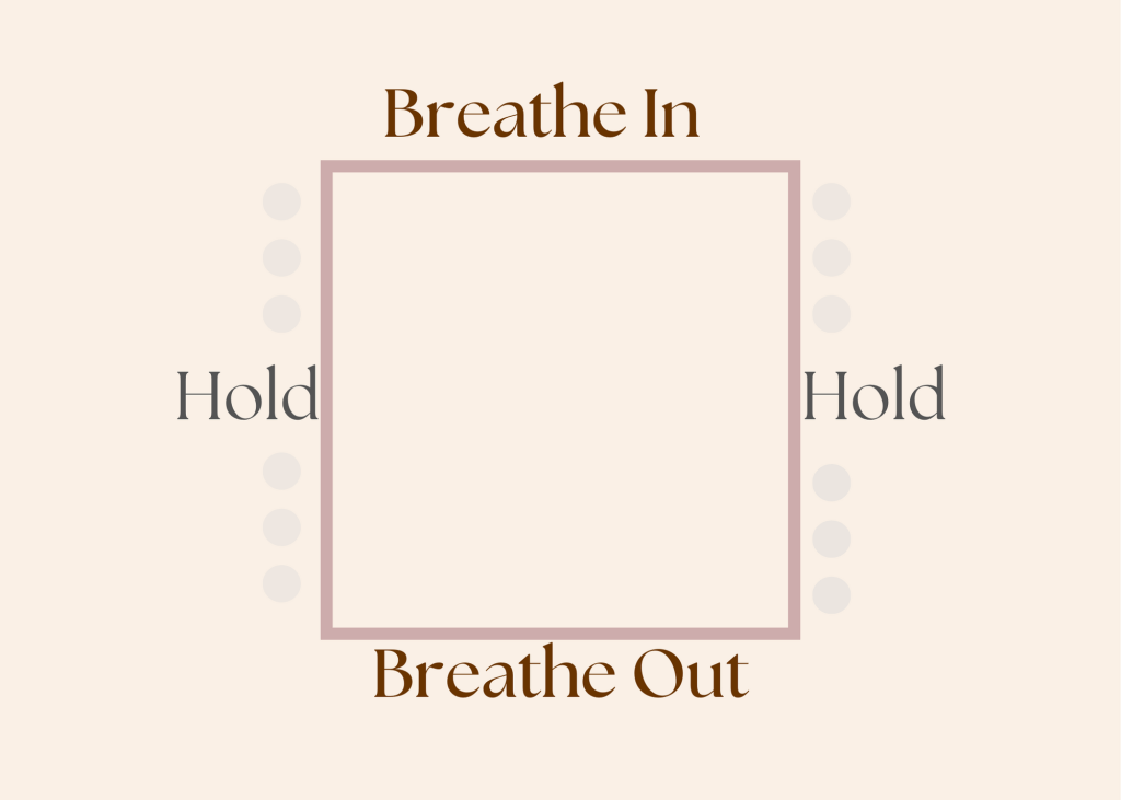 When you are ready, use the following diagram to guide you through the technique. You can use your eyes or your finger to trace the outline of the square from edge to edge, following the instructions as you do so. You will be inhaling for 4 counts, holding the breath for 4 counts, exhaling for 4 counts, and then holding that moment for 4 counts.